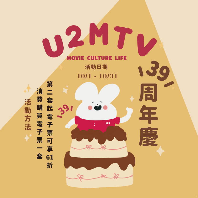週年慶大回饋114/10/1~114/10/31於U2各分館購買電子票第二套起享39%off的折扣! U2電影館39週年慶方案限加購5套,數量有限,售完為止U2電影館保有隨時修正或暫停本活動權利